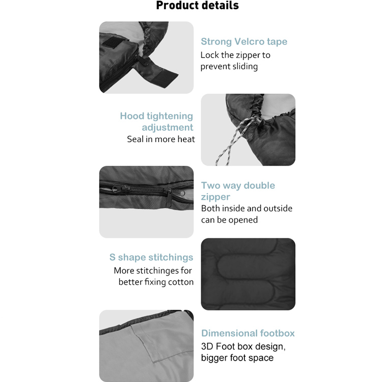 La spaziosa forma a busta offre ampio spazio per le gambe e consente movimenti confortevoli durante il sonno, mentre il design ergonomico del cappuccio fornisce una migliore ritenzione del calore attorno alla testa e alle spalle.