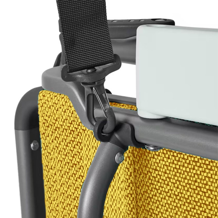 Include una borsa da trasporto resistente e leggera con tracolla per un facile trasporto. Una volta piegata, la sedia mantiene un profilo sottile che si adatta perfettamente al bagagliaio dell'auto e ai vani portaoggetti.