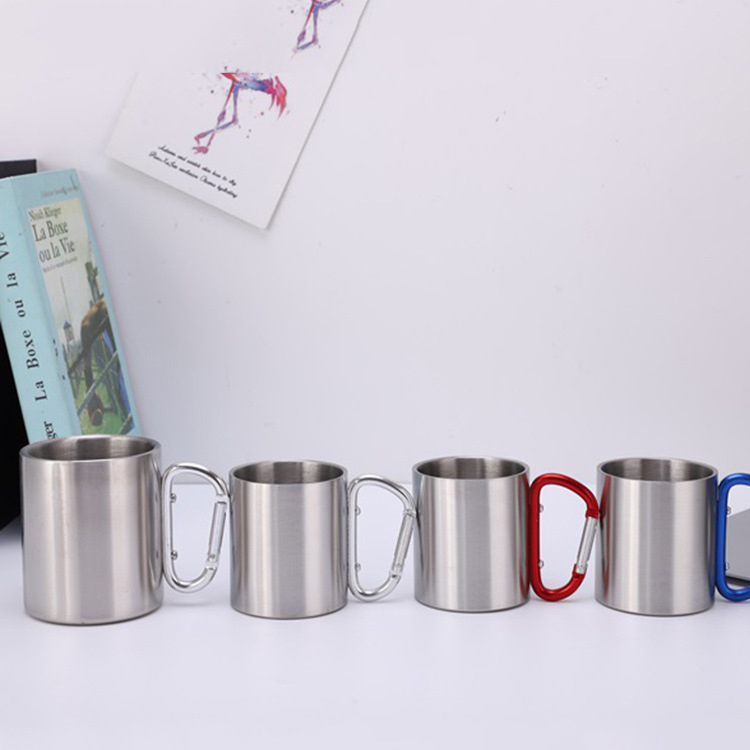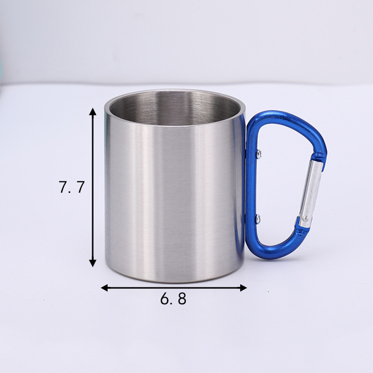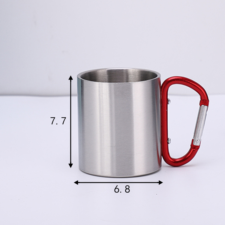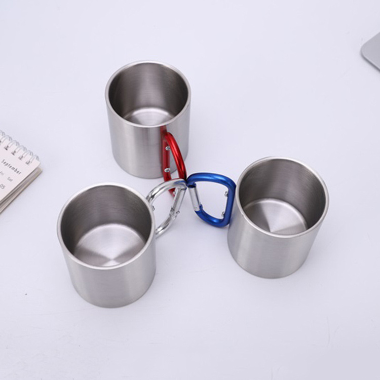 Bicchiere da viaggio in acciaio inossidabile a doppia parete da campeggio. La tua soluzione termica portatile definitiva per avventure all'aria aperta. Questo bicchiere in acciaio inossidabile da 220 ml è dotato di isolamento sottovuoto a doppia parete e di una comoda maniglia a moschettone. Perfetto per i viaggi, mantiene la temperatura ottimale sia per le bevande fredde che per quelle calde.