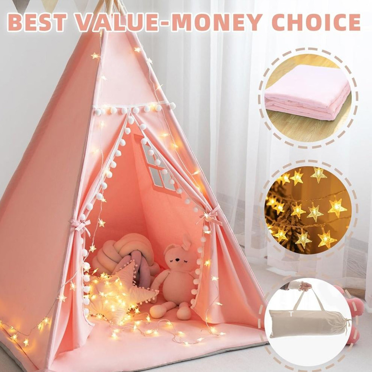 Tenda Teepee per bambini in tela di cotone Playhouse per bambini con tappetino. Il tuo spazio di gioco magico per avventure creative. Questa tenda Teepee in tela di cotone include un comodo tappetino, incantevoli luci stellari e una comoda custodia per il trasporto. Perfetto per ispirare giochi fantasiosi e creare ricordi d'infanzia duraturi.