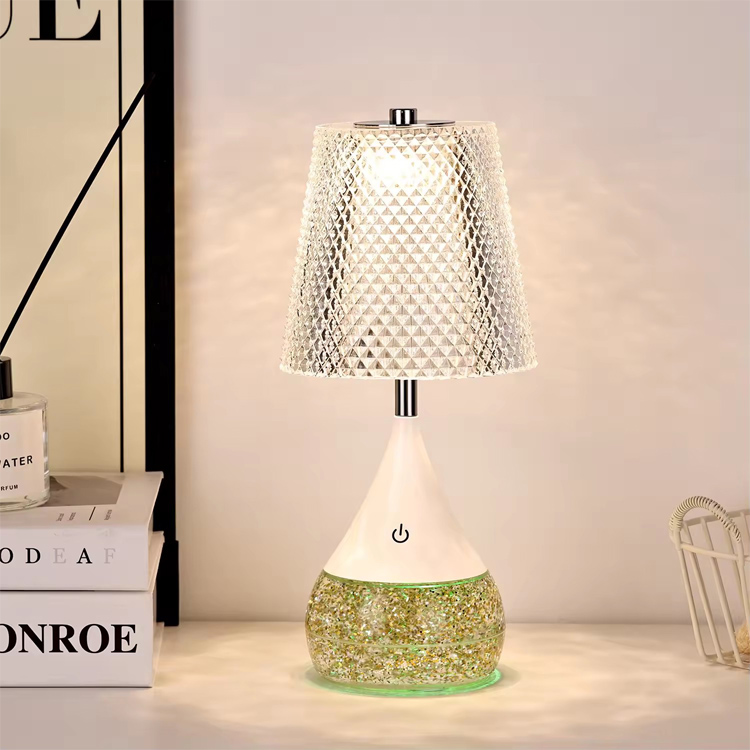Lampada da scrivania a forma di cubo bottiglia con luce notturna RGB dallo stile raffinato. Elegante lampada da tavolo a LED con paralume in cristallo e base piena di glitter, perfetta per aggiungere un tocco di glamour a qualsiasi stanza. Dispone di un pulsante di accensione sensibile al tocco per un facile utilizzo.