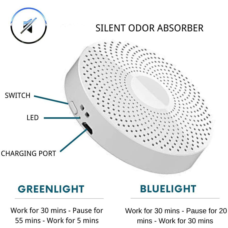 DUE MODALITÀ DI LAVORO FACILI DA USARE: questo mini eliminatore di odori USB può essere utilizzato in 2m³lo spazio è rapido ed efficace in 15 minuti. Tasso di disinfezione fino al 99,9% in 2 ore.