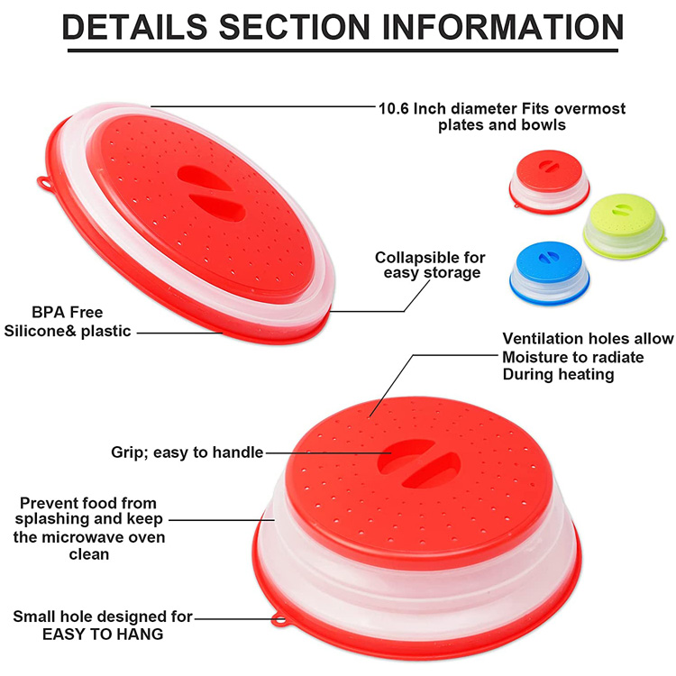 In qualità di produttore professionale, vorremmo fornirti un coperchio pieghevole per microonde in silicone di alta qualità. E ti offriremo il miglior servizio post-vendita e consegne puntuali.Coperchio piatto per alimenti pieghevole a prova di schizzi per microonde con impugnatura facile da impugnare, protezione per coperchio antischizzi per microonde lavabile in lavastoviglie con prese d'aria per vapore, silicone e plastica senza BPA, rotondo da 10,5 "