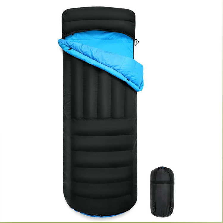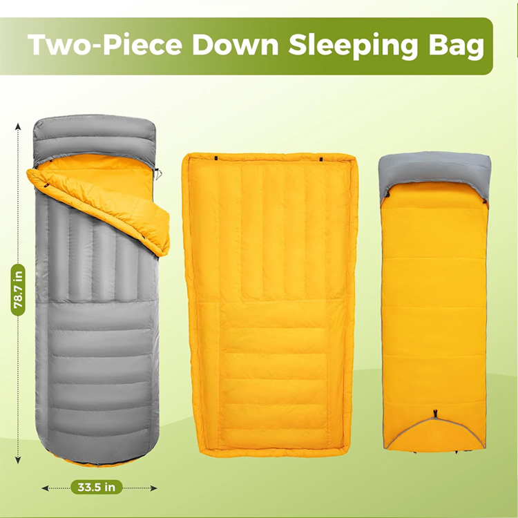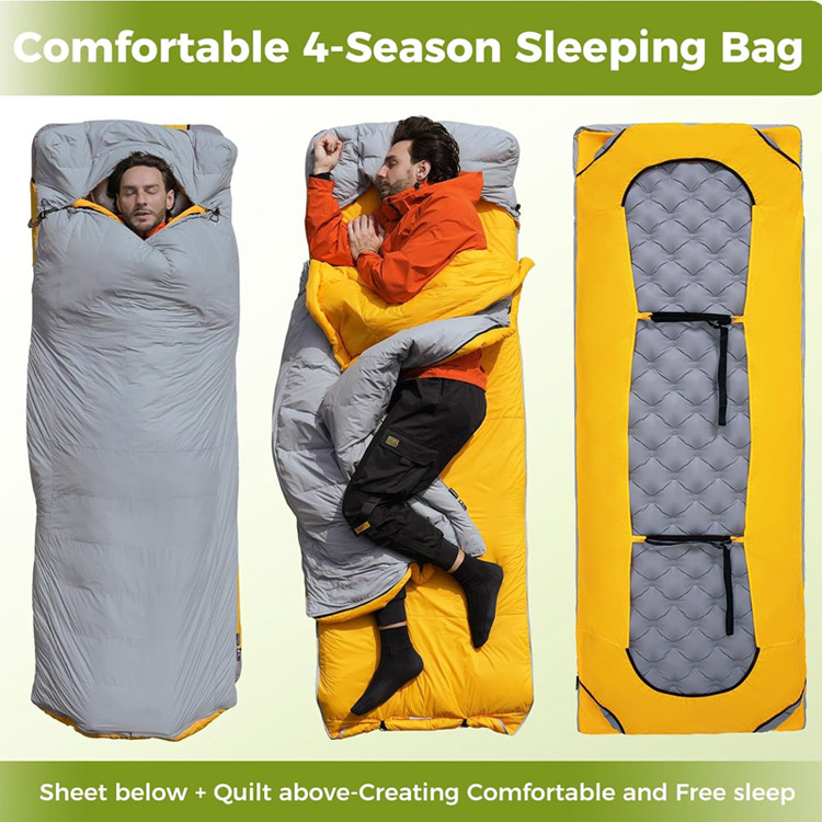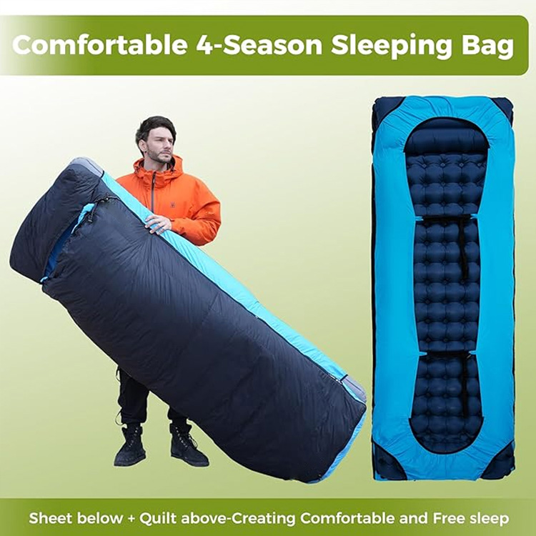 Coperta da campeggio ultraleggera in piuma d'anatra. Il tuo sistema di sonno definitivo per quattro stagioni per avventure nella natura selvaggia. Questo sacco a pelo ultraleggero combina l'isolamento premium in piuma d'anatra con un cuscino gonfiabile integrato. Funzionando sia come topquilt che come sacco a pelo, offre il massimo calore senza compromettere il peso.